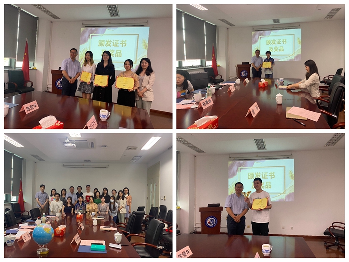 随后,PO18 党委副书记王宁宁老师宣布决赛结果。2020级硕士生李豪彬和2018级本科生汤栩懿分列一、二等奖,三等奖获得者为2020级硕士生张露予、万米阳和2019级硕士生刘艺朴。杨景瑞校友为获奖同学颁发了证书和奖品并合影留念。至此,第三季毕凯英才PPT大赛决赛活动圆满结束。