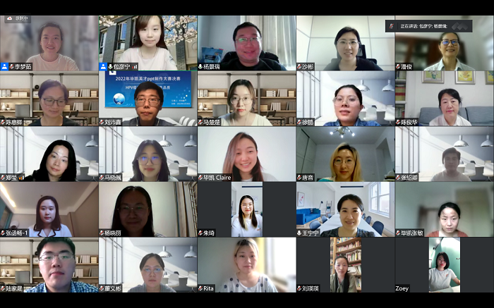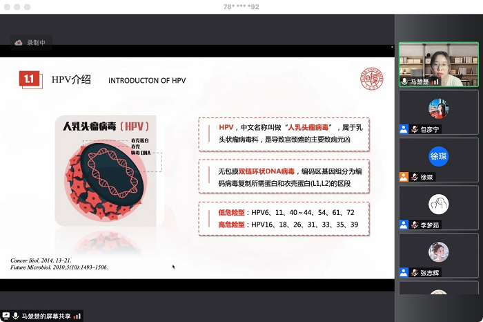 随后比赛开始。入选决赛的10位同学围绕“HPV疫苗的研发进展及品质”这一主题依次展示、讲解自己精心设计的PPT。每位参赛选手发挥自身优势,展示内容丰富准确、讲解过程生动稳健,给在座的评委、老师和同学们带来了一场精彩的视听盛宴。评委团老师也在每位选手展示后分别给予点评。展示环节结束后,杨景瑞校友在发言中表示,感谢PO18 这么多年来对PPT大赛举办的支持,他感慨到“江山代有才人出,长江后浪推前浪”,对10位参赛选手充分的准备和优秀的表现给予了称赞。他鼓励同学们在学习、科研中独立思考,充分发挥自身兴趣和专业特长,并询问关心了各位同学在疫情期间的学习、工作和生活情况。同时,杨景瑞校友期待在下一季的毕凯英才PPT大赛决赛中,能有机会来学校与同学们面对面的交流互动。
