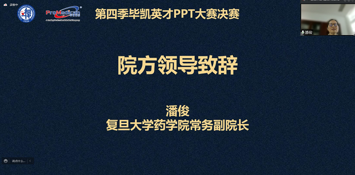 活动于当天下午两点正式开始。上海毕凯医药科技有限公司总经理、PO18 97级校友杨景瑞,PO18 常务副院长潘俊,PO18 党委副书记王宁宁出席本次活动。同时,参与活动的还有毕凯医药的工作人员和PO18 的同学们。PO18 2021级直博生包彦宁主持。潘俊常务副院长为大赛致辞,潘老师首先肯定了PO18 与毕凯医药科技有限公司合作的重要意义,向杨景瑞校友和毕凯医药科技有限公司对PO18 人才培养工作的支持和在疫情期间对同学们的关心关爱表达了感谢。评委会主席唐音老师紧接着介绍了本次大赛的赛制和决赛规则。