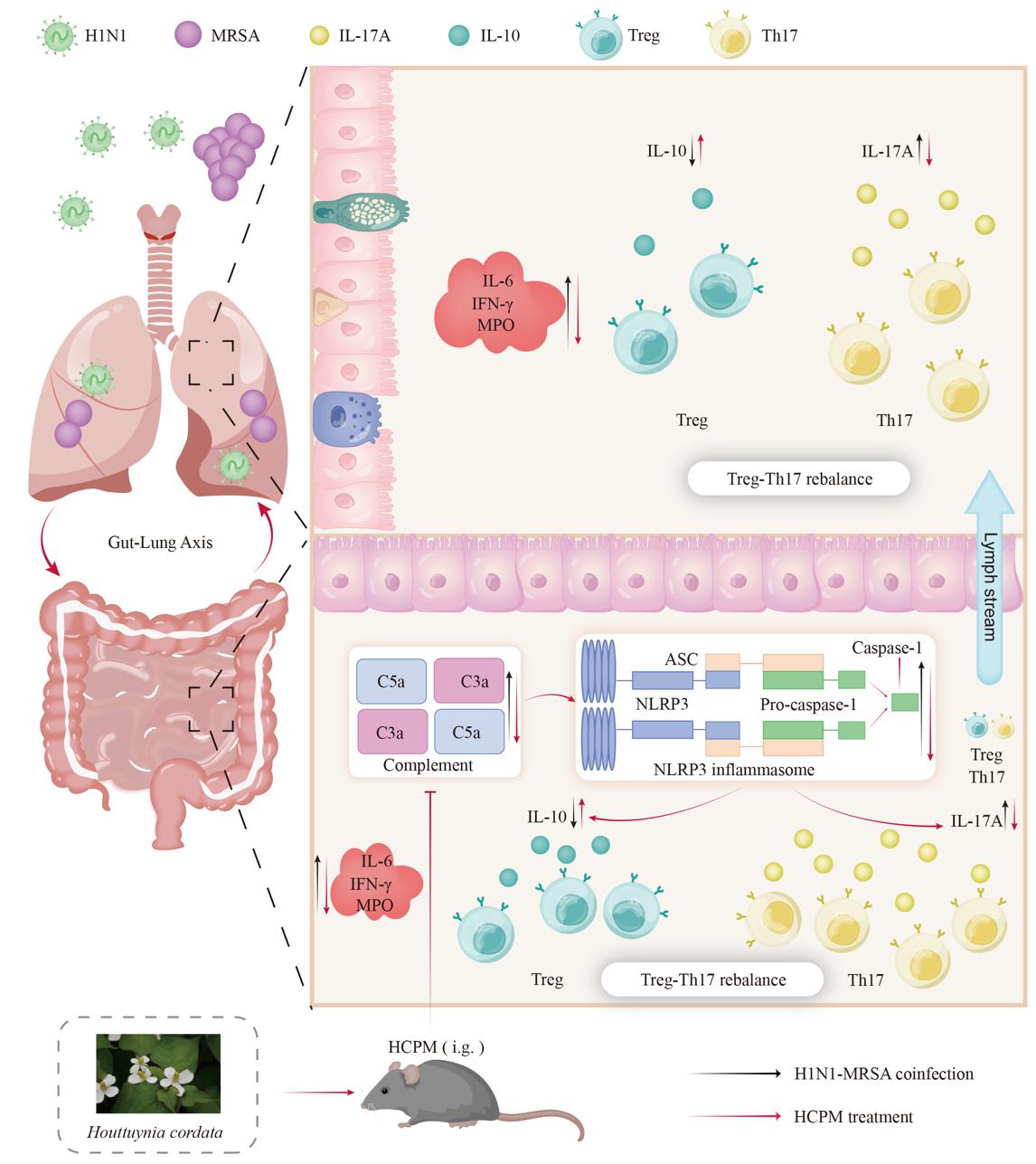 鉴于此,PO18陈道峰教授、李继扬副教授、力弘副教授研究团队建立了甲型流感病毒(H1N1)与耐甲氧西林金黄色葡萄球菌(MRSA)合并感染的代表性小鼠肺炎模型,并进一步揭示了具有抗补体活性的鱼腥草多糖对H1N1与MRSA合并感染引起的重症肺炎的治疗潜力, 阐明了其通过抑制NLRP3炎症小体并调节肠-肺轴Treg/Th17细胞失衡实现“从肠治肺”的作用途径。相关成果以“An anti-complement homogeneous polysaccharide from Houttuynia cordata ameliorates acute pneumonia with H1N1 and MRSA coinfection through rectifying Treg/Th17 imbalance in the gut–lung axis and NLRP3 inflammasome activation”为题,在线发表于国际知名期刊Acta Pharmaceutica Sinica B。