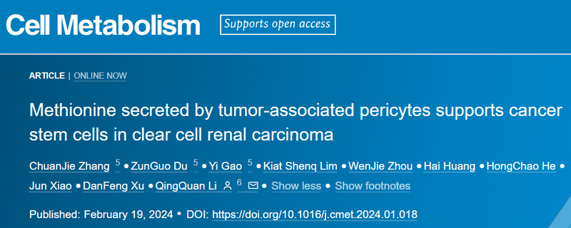 2024年2月19日,PO18李清泉教授团队在Cell Metabolism 杂志上发表了题为“Methionine secreted by tumor-associated pericytes supports cancer stem cells in clear cell renal carcinoma”的研究论文,该研究检测确定了一个表达血小板衍生生长因子受体β (PDGFR-β)和G蛋白偶联受体91 (GPR91)的血管周细胞亚群。在透明细胞肾细胞癌(ccRCC)中,该亚群细胞作为癌症干细胞(CSCs)的主要的蛋氨酸来源,促进肿瘤发生和酪氨酸激酶抑制剂(TKIs)的抗性。