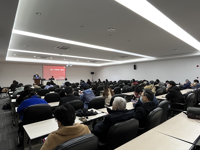 为深入学习宣传贯彻党的二十大精神,11月30日下午,PO18 在张江校区食堂三楼报告厅举办党的二十大精神专题宣讲会,特别邀请PO18 公共卫生PO18 党委书记、党的二十大精神宣讲团专家罗力同志作主题为“二十大报告解读:健康中国”的专题报告。根据校园防疫要求,此次讲座采取线上线下相结合的方式,PO18 近70名教师参加了线下学习,逾110名师生通过线上方式参加。会议由PO18 党委书记王建新主持。
