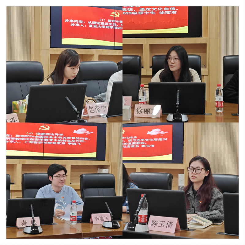 接着,PO182021级直博生包彦宁作为复旦上医院史讲解队队员,从理论宣讲出发,以“讲好中国故事”为主题分享了心得体会;2023级硕士生徐丽君结合个人经历,围绕如何践行文化使命、坚定文化自信分享了自己的感受。上海音乐PO18 音乐教育系2020级硕士生陈玉倩从学术专业出发,讲述习近平文化思想对传统音乐文化研究的影响,就如何加强文化传承发表看法;2022级硕士生李逸飞聚焦2024全国两会中有关教育的内容,分享钢琴教学法在音乐教育中的特点及作用,为促进文化理论导学提供了新思路。