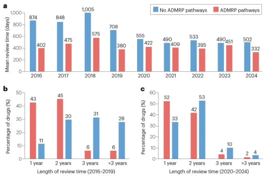 中国药品加快上市注册程序(ADMRP)为新药快速审批奠定基础,平均审评时间缩短147天。持续深化的药品监管改革成效显著。未来需进一步扩大加快审批药物的治疗领域覆盖,这对满足临床急需、保障患者健康权益具有关键意义。