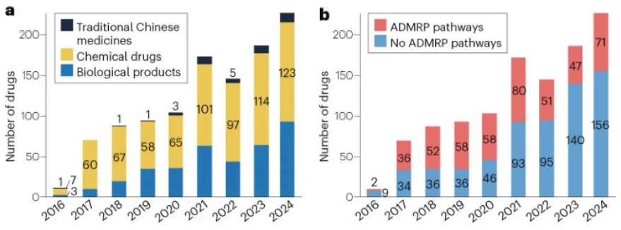 2016-2024年期间,中国国家药品监督管理局(NMPA)累计批准1100个新药申请,其中化药692个(63%)、生物制品368个(33%)、中药40个(4%)。在1100个新药中,近40%(455个)通过加快上市注册程序(ADMRP)获批。2020-2024年间新药主要通过三种ADMRP途径获批上市:优先审评审批(PRA)276个、附条件批准(CA)121个,突破性治疗药物(BTD)55个。
