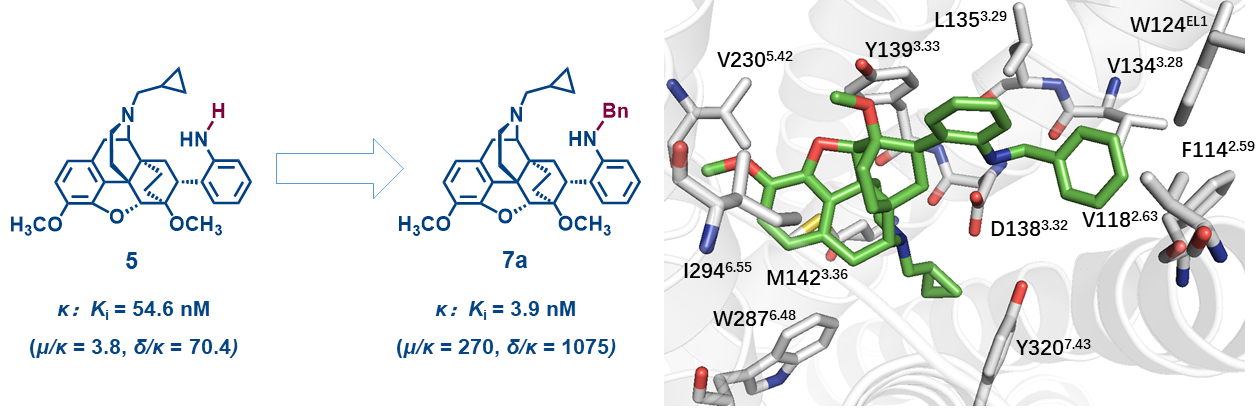 本研究通过一系列N-环丙甲基-7α-邻取代苯基-6α,14α-内亚乙基-去甲蒂巴因衍生物的设计、合成及生物活性评价,建立完整构效关系,发现化合物7a对KOR具有纳摩尔级激动活性以及良好的亚型选择性 (KOR, Ki = 3.9 nM, MOR/KOR = 270, DOR/KOR = 1075; [35S]GTPγS binding, EC50 = 3.4 nM)。化合物7a在多个种属啮齿类动物的不同疼痛模型中都表现出了长效强效镇痛效果(热板法, ED50 = 0.20-0.30 mg/kg, i.p.;扭体法,ED50 = 0.20-0.60 mg/kg, i.p.),其KOR激动介导体内镇痛机制得到证实。值得注意的是,化合物7a在镇痛剂量下没有表现出明显的焦虑及镇静等中枢副作用,值得进一步研究开发。