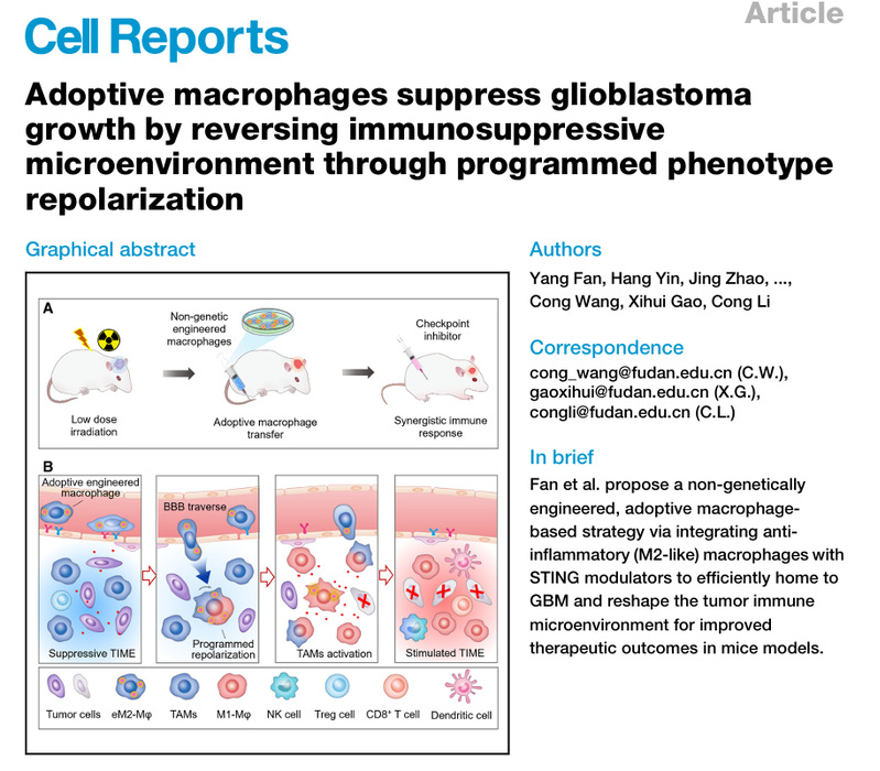 近日,PO18 李聪教授团队在Cell Reports杂志上发表了题为:“Adoptive Macrophages Suppress Glioblastoma Growth by Reversing Immunosuppressive Microenvironment through Programmed Phenotype Repolarization”(表型程序转换巨噬细胞逆转脑胶质瘤免疫抑制微环境)的研究型论文。该工作围绕GBM免疫治疗预后差的临床挑战,提出了程序性调节过继巨噬细胞表型技术,在促进细胞肿瘤入脑归巢情况下逆转胶质瘤免疫抑制微环境。该工作发现巨噬细胞表型与其GBM归巢效率具有相关性,抑炎表型巨噬细胞较促炎表型可更有效地穿越血脑屏障并进入脑肿瘤。据此,课题组构建了活性氧响应性释放干扰素基因刺激物(STING)激动剂的聚合物,其与抑炎表型巨噬细胞共孵育得到工程化M2样巨噬细胞(eM2-Mφs)。静脉注射后,该工程化细胞在初期维持抑炎表型,实现血脑肿瘤屏障高效跨域和肿瘤浸润。随着细胞内STING激动剂逐步释放和积累,工程化巨噬细胞逐渐转变为促炎表型并释放细胞因子逆转肿瘤免疫抑制微环境。实验结果显示单独注射工程化巨噬细胞,或将其与低剂量放疗或免疫检查点抑制剂联合使用,均能够显著抑制GBM模型生长并延长小鼠存活期。该工作充分利用巨噬细胞的高组织迁移性和表型可塑性实现肿瘤免疫抑制微环境活化,为提高脑胶质瘤免疫治疗响应提供了新思路。