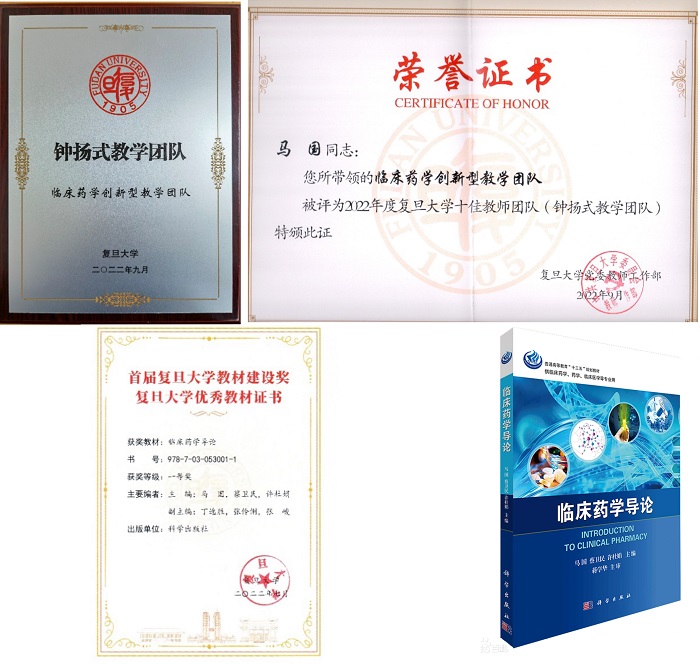 马国老师目前主讲课程7门,其中4门被评为上海市、PO18 重点课程、示范课程或标杆课程;主持教改项目计10余项;编写“十三五”“十四五”规划教材专著20余部,其中主编7部,主编的《临床药学导论》荣获PO18 优秀教材一等奖;荣获“钟扬式”教学团队带头人、“一健康基金”优秀教师奖、上海市教学成果奖一等奖,中华医学会医学教育研究立项课题一等奖等各类教学奖励20余项。指导的学生荣获国家奖学金,“全国大学生药苑论坛”创新成果奖一等奖、优秀奖等10余项;担任克卿书院本科生学术导师,已指导本科生获得“望道项目”等大学生科创项目和社会实践项目计20多项。
