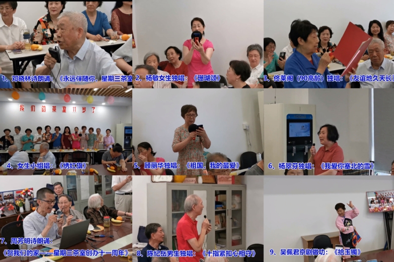 活动由PO18 退教协会长朱建华老师主持。他不落窠臼,程序新颖,成功地主持了这次活动。随着庆典的正式开始,退休教师们纷纷登台献艺,为大家带来内容丰富、形式多样的精彩节目。其中,有会员自己创作的诗朗诵,如邓晓林老师等的《永远伴随你—星期三茶室》、《贺我们的家——星期三茶室创办11周年》;有女生独唱,由杨敏、顾丽华、佟莱阁、杨翠芬老师分别演唱的《珊瑚颂》、《祖国,我的最爱》、《友谊地久天长》《我爱你,寨北的雪》;有男生独唱,由陈纪岳老师演唱的《十指紧扣心相守》;还有张锦英、杨敏等12位老师表演的女生小合唱《绣红旗》。最后一个压轴戏,由年届八旬、颇有表演艺术天赋的吴佩君老师踩着京剧《拾玉镯》的音乐曲调表演全套京剧做功。她动作灵巧,步态轻盈,颇俱专业水平的表演博得了大家热烈的掌声与喝彩。