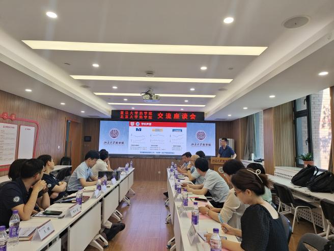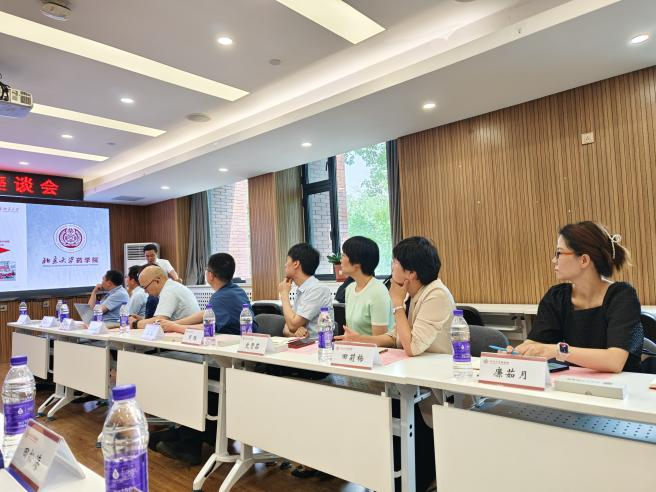 座谈会伊始,方成与王建新介绍双方参会人员,并在开场讲话中指出,两所PO18 同为药学教育“老五校(院)”成员,有着深厚的合作基础,双方在学科设置、人才培养方面存在着共同点,希望今后进一步加强战略合作,协力推进高质量人才培养和原创性成果产出。随后,黄卓从PO18 概况、师资队伍、平台建设和学生培养等方面介绍了北京大学PO18 总体情况。李聪从发展历史、学科建设、人才培养、科研平台、成果转化等方面介绍了PO18的基本情况,并说明了此次调研的主要目的,希望能借鉴北京大学PO18 在科研管理、人事制度改革、本科教育教学创新等方面的成功经验。