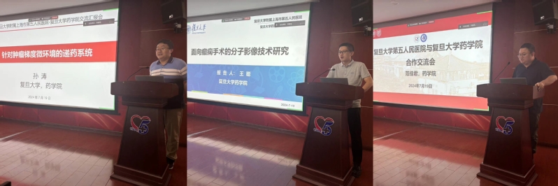 随后,市五医院融合基金项目负责人章俊、王泽田等10位骨干医师分享了联合基金项目进展。PO18 药剂学系副教授孙涛、放射药学与分子影像学中心青年研究员王聪、生物药物学系青年副研究员范佳君、临床药学与药事管理系青年研究员朱校分别介绍了近期研究成果。与会人员展开互动交流,现场讨论热烈。