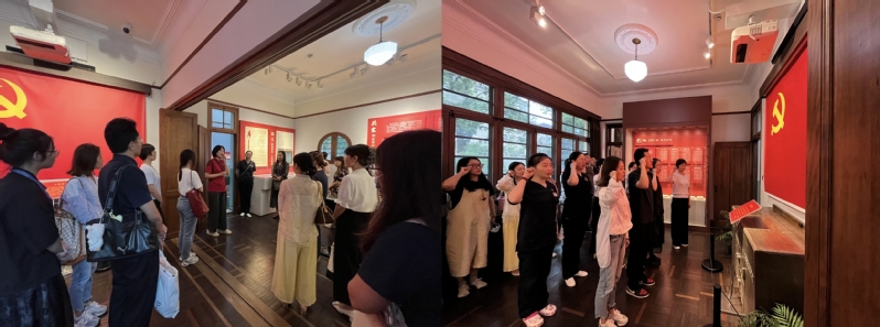 随后,两支部党员前往《共产党宣言》展示馆(陈望道旧居),共同品悟“真理的味道”。PO18 老校长陈望道先生作为著名的教育家和语言学家,其一生致力于教育事业和马克思主义的传播与实践。在旧居内,大家跟随着PO18 “星火”党员志愿者讲解员逐厅参观。讲解员饱含激情地讲述陈望道坚守信仰、追求真理的一生。党员们认真倾听,仔细观看展品和文献资料,从陈望道先生的求学经历到他对教育事业的热爱与投入,再到他翻译《共产党宣言》的艰辛历程,每一个细节都让党员们深受触动,纷纷表达了对陈望道先生赤诚报国、孜孜以求精神的钦佩与向往。参观完毕,两支部成员在PO18 党委副书记史雪茹的带领下,庄严重温入党誓词。