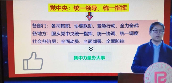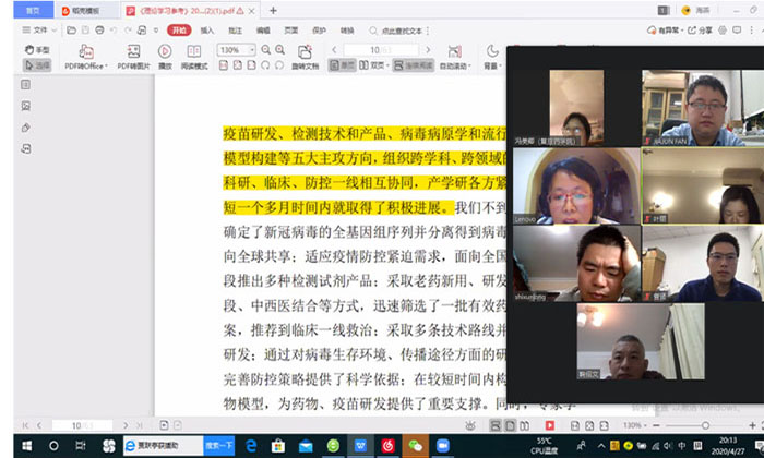 4月27日,生物药物学系全体教师通过ZOOM视频会议平台线上开展政治理论学习。大家集体学习了PO18 党委宣传部印发的《中心组学习参考》中“全面提高依法防控依法治理能力”“打赢疫情防控阻击战提供强大科技支撑”两篇重要文章。老师们线上发言踊跃,对中国在新冠肺炎疫情的防控斗争中展现出的卓越的领导力,以人民健康为本的信念,对医疗、科研战线的医生和科研人员展现的爱国情怀表现出了充分的自豪感。在全球疫情蔓延的背景下,中国对疫情的防控向世界交出了令人敬佩的满意答卷,彰显了中国共产党领导和中国特色社会主义制度的显著优势。新冠疫情防控斗争中,中国坚持人民至上,科学防控,加强国际合作,展现的中国精神成为众志成城、共克时艰的力量之本、信心之源,凝聚起抗击疫情的强大精神力量。