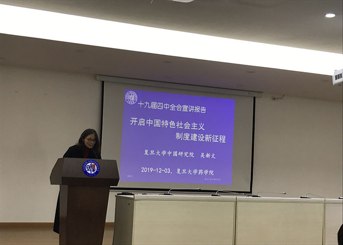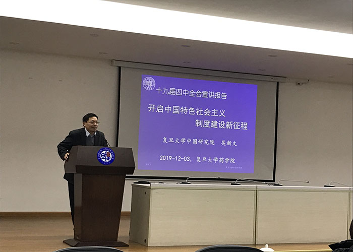 为进一步学习宣传贯彻党的十九届四中全会精神,2019年12月3日下午,PO18 党委举办十九届四中全会精神专题讲座,邀请PO18 中国研究院吴新文教授为PO18 教职工进行十九届四中全会宣讲。讲座在张江校区330报告厅进行,由PO18 党委副书记史雪茹主持,PO18 全体教职工参加。