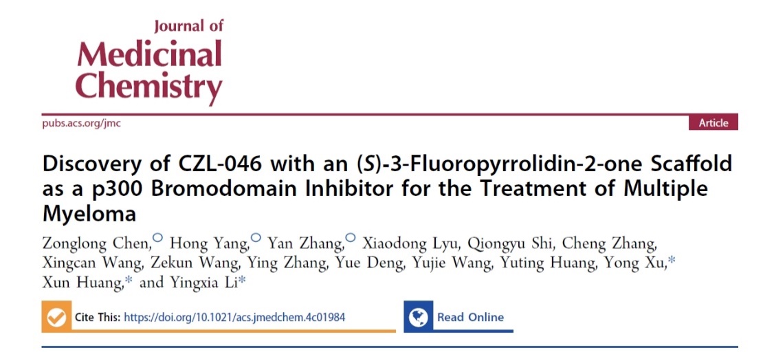 近日,该课题组与临港实验室黄洵研究员课题组、中国科PO18 广州生物医药与健康研究院许永研究员课题组合作在药物化学专业杂志Journal of Medicinal Chemistry上发表了题为“Discovery of CZL-046 with an (S)-3-Fluoropyrrolidin-2-one Scaffold as a p300 Bromodomain Inhibitor for the Treatment of Multiple Myeloma”的研究论文,报道了一种新型p300溴结构域抑制剂CZL-046并研究了抗多发性骨髓瘤的活性和作用机制。