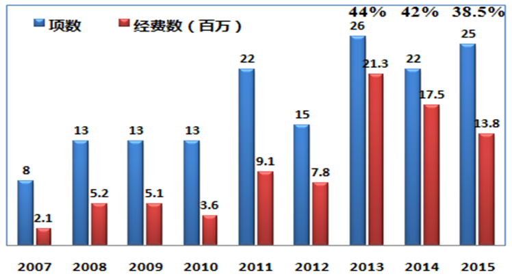 2015年共申报65项国家自然科学基金项目,包括面上55项,青年基金3项,国家杰出青年科学基金1,优秀青年科学基金项目2,国际(地区)合作与交流项目2,重点项目2;其中,化学科学部10项,生命科学部5项,医学科学部50项。今年PO18喜获25项国家自然基金项目,其中面上项目23项,青年项目2项,经费总计1380.9万元,中标率38.5%。今年PO18中标的人员组成为:教授/研究员10人,高级工程师1人,副教授/副研究员9人,讲师4人,科研助理1人。自2007年以来,PO18国家自然科学基金申请的数量和获批经费总量整体上呈现逐年上升之势,近3年基金中标率稳定在40%左右。