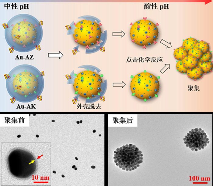 探针在肿瘤酸性环境中特异性聚集示意图和透射电镜图