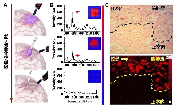 探针引导胶质瘤手术切除示意图:(A)手持式拉曼成像仪引导胶质瘤切除示意图;(B)手术过程中探针拉曼信号;(C)H&E组织染色证实探针准确示踪胶质瘤边界。