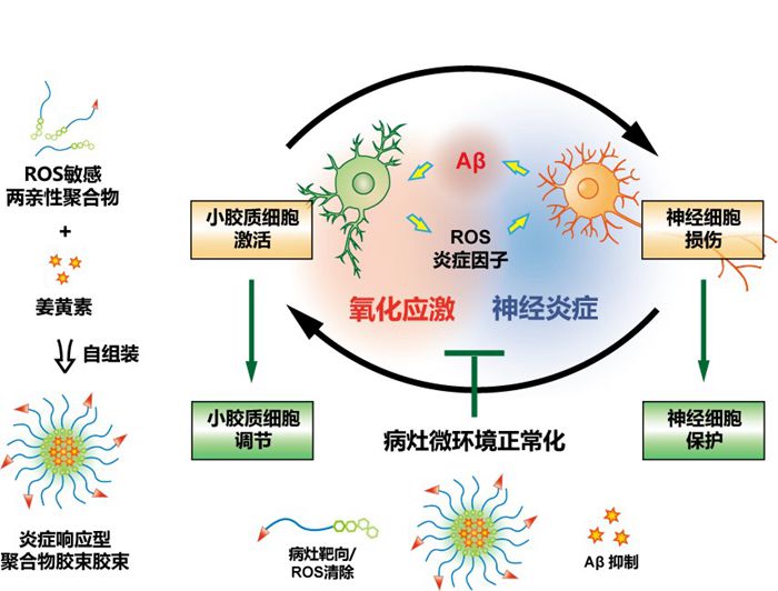 经历了多年来AD药物研发的挫折,研究者提出有效的AD治疗需要着眼于疾病进程的早期阶段,轻度认知障碍等症状的出现标志着AD病程已经进入晚期,此时单纯通过清除蛋白沉积已无法逆转神经损伤,可能是导致Aβ抗体等临床效果不尽人意的原因。小胶质细胞是脑内免疫细胞,受脑内环境严格调控,其在AD早期异常激活所形成的病灶神经炎症和氧化应激微环境影响了脑部整体的代谢功能,与疾病进程恶化密切相关。针对上述AD的微环境特征,该研究以响应炎症病灶高水平活性氧簇(ROS)的聚合物胶束为载体,修饰AD病灶靶向多肽,并包载疏水药物姜黄素,构建了具有微环境调控功能的药物递送系统(图1)。该聚合物胶束能够高效进入AD病灶,通过载体和所载姜黄素的联合作用,清除微环境中的ROS和Aβ寡聚体,多靶点阻断这些促炎分子对小胶质细胞的慢性持续激活,最终纠正小胶质细胞的异常状态,实现了微环境的正常化。这种微环境调控的治疗策略被证明能够有效改善AD模型小鼠的认知功能,为阿尔茨海默症的治疗提供了新的思路。