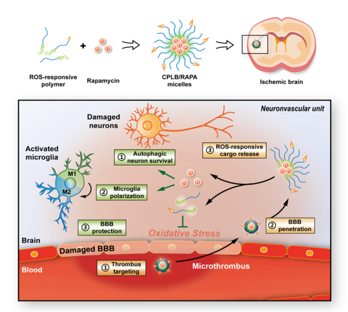 随着脑部疾病研究的不断进展,研究者提出以神经血管单元为基本结构的脑病理机制探究模式。神经血管单元包括神经细胞、脑血管内皮细胞、小胶质细胞等多种脑内细胞类型,在脑卒中再灌注损伤过程中,包括氧化应激、神经炎症、血管损伤等多种病理机制的级联反应使得该结构中的多种细胞同时受到影响,发生代谢、表型以及功能异常。基于以上病理特征,本研究设计并构建了一种能够靶向缺血病灶血管内微血栓的胶束递药系统,包载细胞应激通路调节药物雷帕霉素,以实现神经血管单元内多种细胞的同时调控(图1)。该聚合物胶束能够通过结合微血栓进一步跨越受损血脑屏障进入缺血病灶,在氧化应激微环境中高水平的活性氧簇(ROS)刺激下释放药物,同时消耗ROS;所载药物雷帕霉素能够上调神经细胞自噬水平对抗缺血应激状态、极化小胶质细胞为M2组织修复表型。通过载体与药物的联合作用,聚合物胶束能够实现有效的神经保护、小胶质细胞调控以及血脑屏障功能恢复,重塑神经血管单元的生理功能,增强微循环的血流灌注并减小脑部梗死灶面积。
