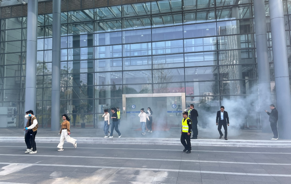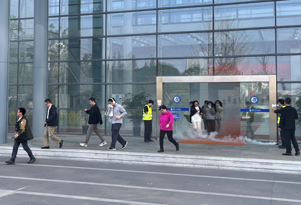 随着消防铃声的骤然响起,演练正式开始。各楼层紧急疏散人员迅速响应,按照预定的紧急疏散路线,有条不紊地组织师生从安全逃生通道撤离至室外空旷区域,并清点人员。与此同时,防护搜救人员穿梭于各楼层之间,仔细确认是否有被困人员,确保所有人安全撤离。短短5分钟内,全院350余名师生全部安全逃生,整个疏散过程高效有序。