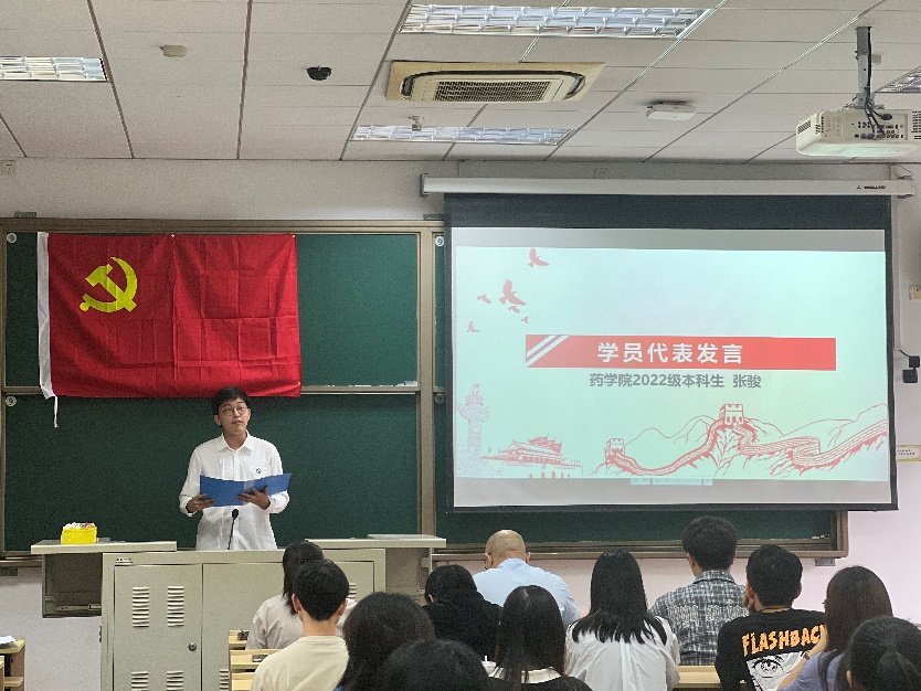 随后,PO18 2022级本科生张骏作为学员代表发言。他以信仰作为分享主题,在经历了在PO18 的学习生活,深入了解院史和中国医药发展现状,他也更坚定选择药学专业的信仰。他号召学员们身逢盛世,更应勇担青年使命。身为药学专业的学生,应该发挥自身专业特长,提升自己的专业能力,锻炼自己的专业素养,拓展自己的眼界与格局,攻坚克难,不断钻研,争取为祖国医药行业的发展做出自己的贡献。