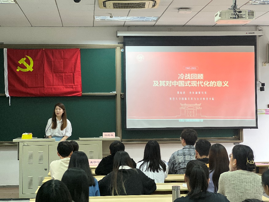 接下来,PO18 国际关系与公共事务PO18 青年副研究员银培萩老师为大家带来《理解中国式现代化——从冷战中的可乐贸易说起》复旦主题党课。银培萩老师向学员们介绍了冷战的起源、冷战中涉及到的两种不同的经济制度,冷战中的“可乐贸易”和冷战带来的俄罗斯和北约东扩的阴影。她生动的讲解让学员们从别样的角度理解了中国式现代化,回顾历史、了解国际局势;展望未来、坚持中国特色。