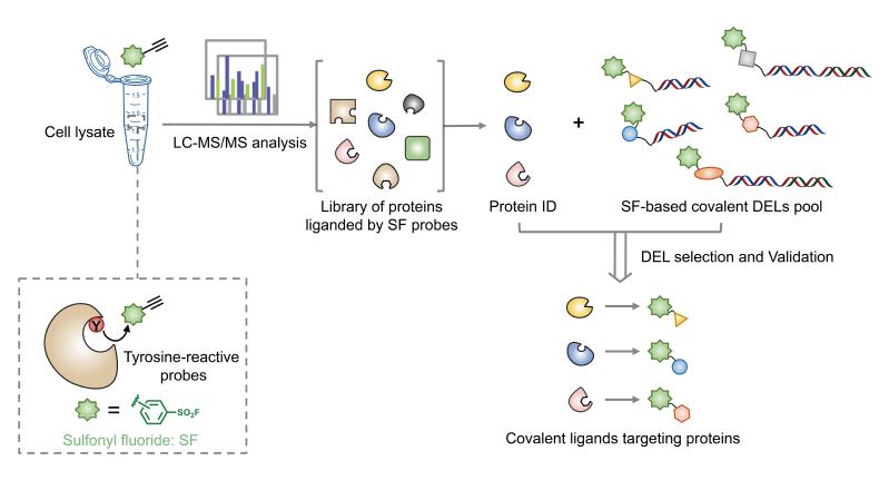 合作团队首先通过基于活性的蛋白组学分析技术鉴定了磺酰氟亲电体探针的反应性蛋白谱,筛选出能够与磺酰氟弹头反应的蛋白库;同时,构建了化合物数量达千万级的携带磺酰氟弹头的共价DEL库,利用该共价DEL库针对上述反应性蛋白库内靶蛋白进行共价配体筛选验证;以挑选的三个具有不同催化功能的酶作为模型蛋白进行普适性验证,均成功获得了高活性的命中化合物(对靶蛋白抑制活性最高可达70 nM)。在酪氨酸反应位点、共价结合模式、靶点选择性、集中库筛选等多个方面对命中化合物进行验证,表明该筛选方法具有优异的筛选效率、命中率和稳定性。