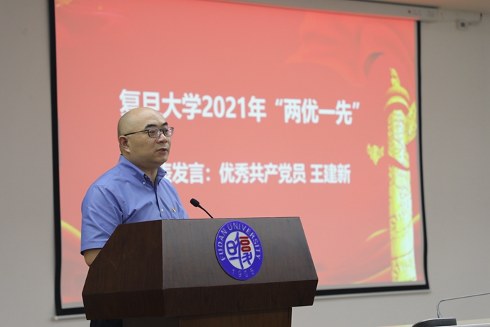 优秀共产党员王建新同志作为“两优一先”代表发言。他谈到没有共产党就没有新中国,经过百年奋斗,中华民族迎来了从站起来、富起来到强起来的伟大飞跃,迎来了实现伟大复兴的光明前景。作为九千万分之一,我们每位党员需要思考如何发挥模范带头作用。一是心有所信,方能行远。面对复杂又艰巨的国内外环境,我们作为教育和科技工作者要增强责任之心,勇于担当作为,以与时俱进的精神、革故鼎新的勇气迎难而上,为这个时代做出贡献。二是要传承红色基因,凝聚奋进力量。PO18 的诞生也是一个革命故事,上海著名爱国实业家项松茂先生早年大力倡导自制国货、创新药品,在抗日战争期间组织药厂职工成立抗日义勇军,紧急为前线供应军用药品,遭到日本特务监视,惨被杀害。项松茂以身殉国后,为承其遗志,五洲大药房特捐款建造松德堂,这是PO18 最早的教学楼。回顾历史令人感慨,药学专修科经过多年发展成为国内领先的PO18 ,这是一代又一代党员前辈们克服重重困难、辛勤努力的结果,我们要不忘立德树人初心,牢记为党育人、为国育才使命,传承和弘扬红色基因。三是一代人有一代人的责任,我们要增强创新第一动力,为后辈们留下一个蓬勃发展的PO18 。目前生命科学和药学领域的发展突飞猛进,不进则退,我们要既能潜心教书育人,又能积极投身科研,把论文写在祖国大地上。