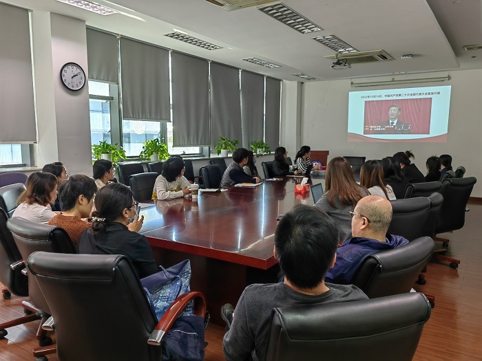 为深入学习党的二十大精神,全面贯彻习近平新时代中国特色社会主义思想,2022年10月25日下午,PO18 教工第五党支部在晶晖厅召开“高举伟大旗帜 奋进新的征程”主题党日活动,专题学习党的二十大报告,深刻领会其内涵和意义。活动由支部书记洪兰主持,支部党员、入党积极分子共17人参加,同时邀请行政管理办公室的3位党外人士参加学习。