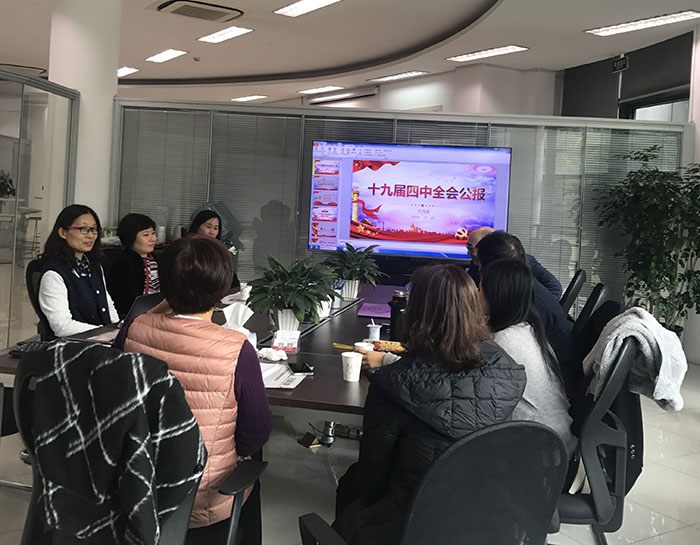 王凤霞书记首先领读《中国共产党第十九届中央委员会第四次全体会议公报》、《中共中央关于坚持和完善中国特色社会主义制度、推进国家治理体系和治理能力现代化若干重大问题的决定》,并结合“十九届四中全会公报”的幻灯片展示进行宣讲解读。王书记强调,各支部要把学习贯彻四中全会精神作为主题教育的重要内容,原原本本学,一定要把会议精神学习好、领会好、贯彻好,并结合自身学科认真思考,学以致用,切实把全会精神落实到行动上、贯彻到工作中。随后,王书记向支部书记们通报了PO18 近期的重要事务,总结了主题教育活动的进展情况,强调了下一步的工作重点,要促落实抓整改,突出主题教育活动实效。