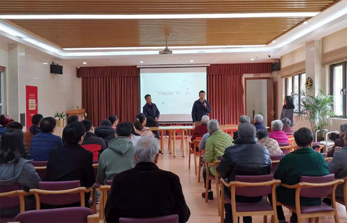 当日上午,阳光明媚,虽是初冬时节,金杨养老院却满眼绿色,花园里的常青植物焕发着勃勃生机。党员们来到金杨养老院,为老人们送上了美丽的鲜花和诚挚的问候,并由教工四支部成员秦晶副教授带来了一场科普讲座——“脑卒中的防治策略”。冬天是脑卒中的高发季节,秦老师结合脑卒中相关的最新临床进展,深入浅出地为老人们讲解了脑卒中这种冬季高发脑血管疾病的起因、自查、预防和相关的心理调适。报告厅座无虚席,不但有白发苍苍的在院老人,就连家属们也慕名而来,认真聆听,反响热烈。