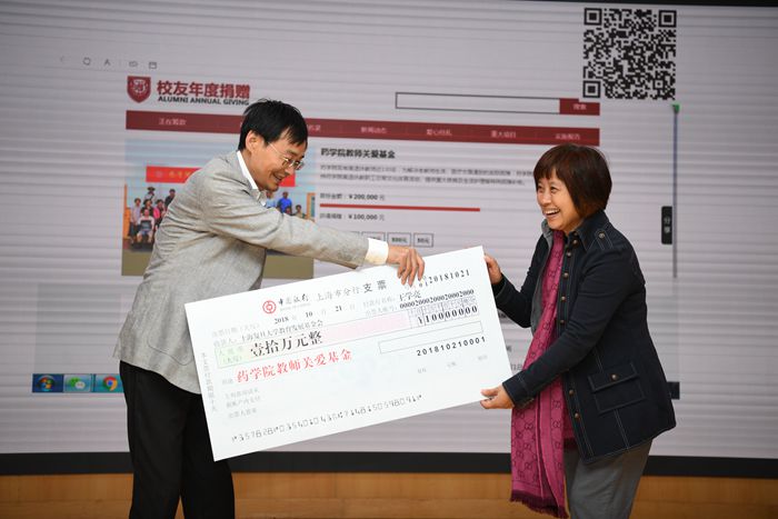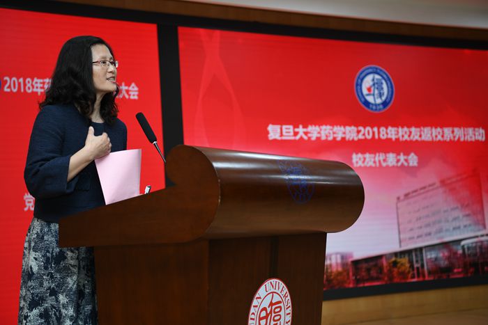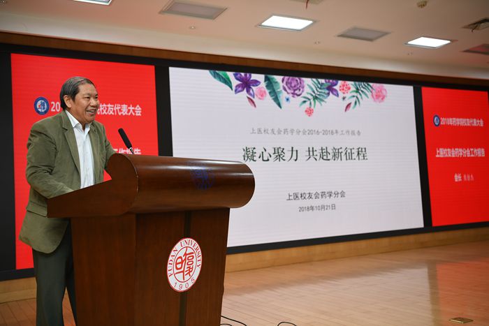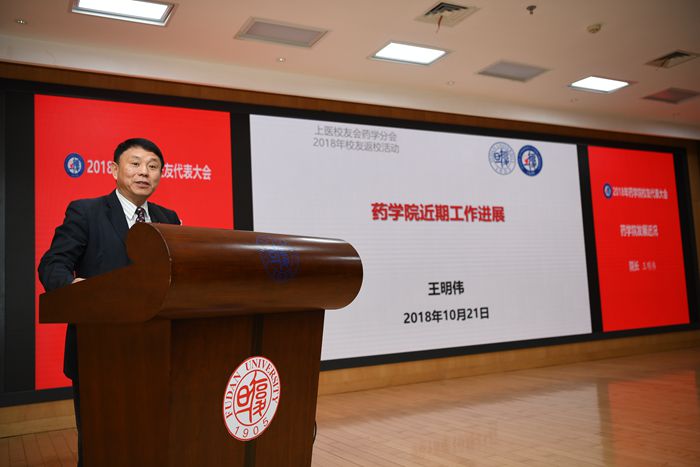 10月21日上午,PO18 校友代表大会暨药学前沿高峰论坛在枫林校区明道楼一楼报告厅举行。在校友代表大会上,PO18 党委书记王凤霞致欢迎词。上医校友会药学分会会长熊仿杰做2016年?2018年校友会工作报告。PO18 院长王明伟在PO18 近期工作进展报告中向与会校友介绍了PO18 近年来所取得的成绩和今后发展所面临的机遇与挑战。PO18 常务副院长潘俊向校友们介绍了PO18 近年来接受捐赠的情况,她感谢校友们对PO18 事业发展给予的关心和支持,并且向校友们推出了“PO18 教师关爱基金”筹款项目。81级药学专业校友王学亮率先以个人名义捐赠10万元支持该项目,在座的校友和师生以热烈的掌声向他表示感谢和敬意。上医校友会副会长兼秘书长夏海鸥应邀出席并致辞。PO18 对外联络与发展处副处长和PO18 校友会副秘书长恽小婧、PO18 副院长张雪梅、党委副书记毛华、党委副书记王宁宁、各界校友和师生代表近300人出席了校友代表会。