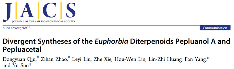 PO18 孙域课题组近期完成了大戟二萜pepluanol A及pepluacetal的发散性全合成,相关成果以Divergent Syntheses of the Euphorbia Diterpenoids Pepluanol A and Pepluacetal为题,在线发表于权威期刊Journal of the American Chemical Society。
