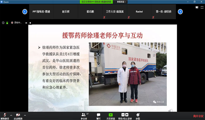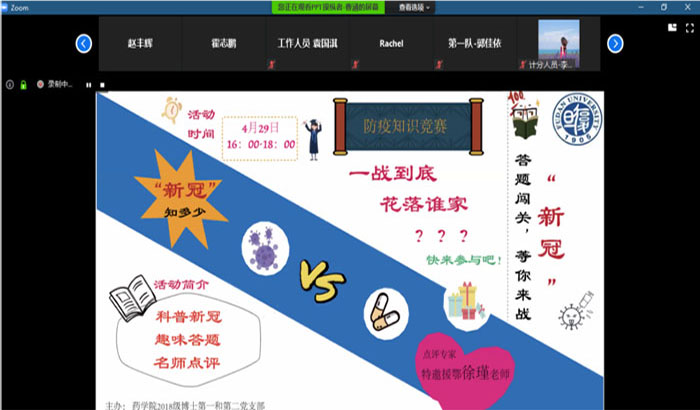 为进一步做好新冠疫情防控的宣传工作,普及当前国家防疫形势、医药研究进展,为国家和学校的防疫工作贡献自己的一份力量,PO18 2018级博士第一、第二党支部联合PO18 教职工第七党支部于2020年4月29日在ZOOM在线会议平台共同举办了主题为《新冠肺炎,“药”你好看》的防疫科普知识竞赛活动。活动还特别邀请了驰援武汉的PO18 附属华山医院药师徐瑾老师为我们分享她在武汉的工作情况与感受。