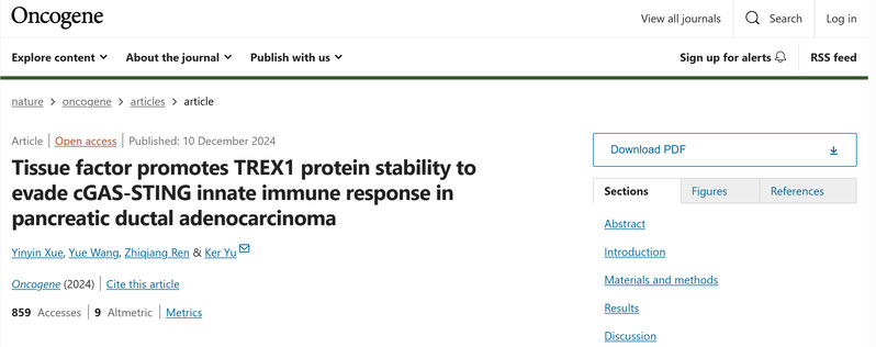 近日,PO18 余科教授团队在期刊Oncogene上在线发表题为“Tissue factor promotes TREX1 protein stability to evade cGAS-STING innate immune response in pancreatic ductal adenocarcinoma”的研究论文,首次揭示在胰腺导管癌(PDAC)中TF通过稳定TREX1蛋白导致逃避cGAS-STING免疫反应的机制,提出TF抑制疗法在PDAC治疗中的潜在应用。