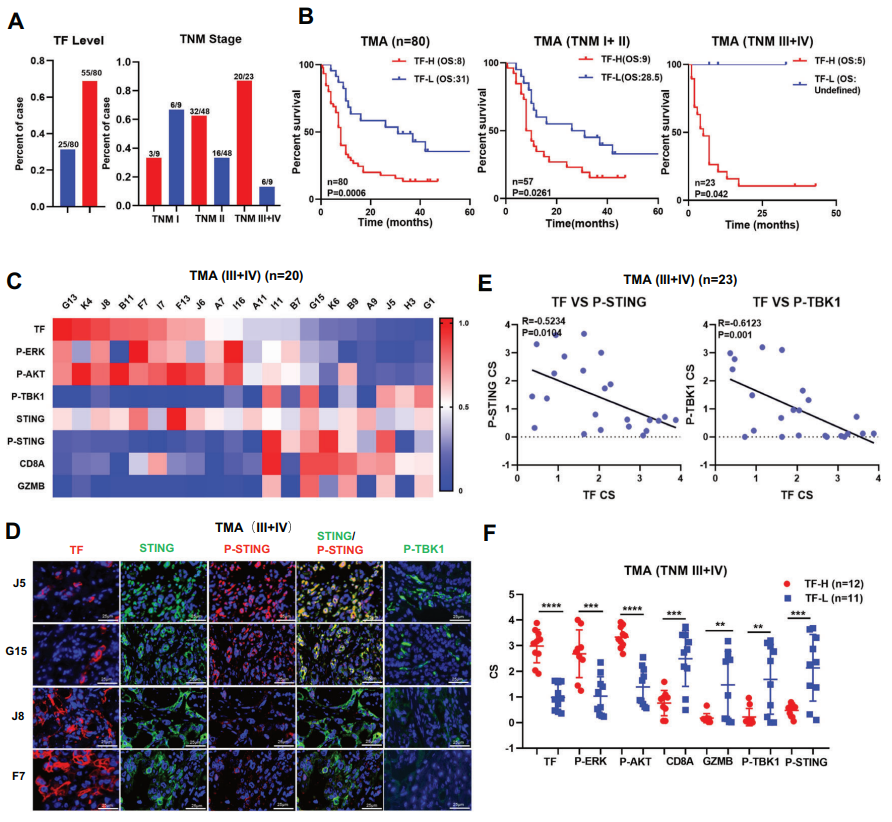 研究通过分析患者基因组学和组织芯片建立了TF与cGAS-STING的关系。TF过表达的患者STING信号激活标志物P-STING/P-TBK1水平极低,干扰素诱导基因(ISGs)和免疫效应细胞的数量减少。此外,通过构建小鼠和人源胰腺原位肿瘤模型,给予敲除TF或者TF抗体(HuSC1-39)治疗,抗肿瘤效果显著并极大地促进了肿瘤内部STING信号激活。