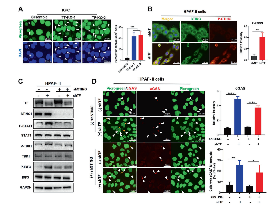 细胞质DNA微核蓄积是触发cGAS-STING先天免疫反应的经典机制,但人们对该调控机制如何在肿瘤中被失效的原因了解甚少。本研究显示PDAC中的TF异常表达能显著降低微核积累,导致cGAS-STING传感链失活。靶向抑制TF后cGAS捕获的胞质微核显著增加,STING信号通路下游CCL5/CXCL10表达显著提高。
