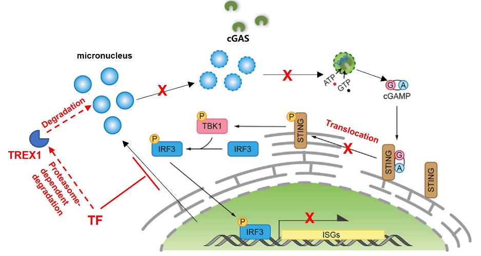 TREX1是一种核酸外切酶,近期被证明可以抑制肿瘤环境中的先天免疫反应。本研究发现给予TF抑制治疗后可迅速触发TREX1的蛋白降解,从而恢复微核蓄积和STING/TBK1级联的磷酸化及功能活性。本研究明确了TF是PDAC中重要的免疫逃逸调节因子;TF抑制剂治疗将提供一种创新疗法,能促进抗肿瘤免疫微环境重塑和治疗效果。