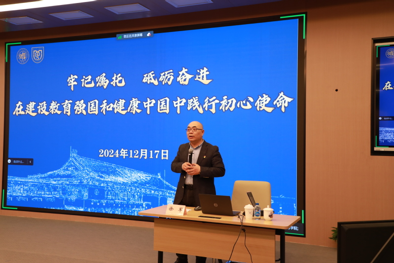 报告会上,徐军从回顾博医团三十年的发展历程出发,传达学习了习近平总书记重要指示精神。接着,围绕“立足当下”“回溯历史”“面向未来”三个维度介绍了博医团精神的源头、内涵和传承,指出博医团的精神就是上医精神——“为人群服务,为强国奋斗”,这与中国共产党“为中国人民谋幸福,为中华民族谋复兴”的初心使命高度一致,是博医团始终高举的精神旗帜,强调新时代的复旦上医人要牢记嘱托、砥砺奋进,为增进人民健康福祉、推进健康中国建设作出新的更大贡献。最后,徐书记结合全国教育大会以及PO18 第十六次党代会精神,紧扣“培养担当民族复兴大任的时代新人”要求,提出三点期望:一是要坚守初心使命,大力弘扬和传承上医精神谱系,通过实践服务丰富上医精神的时代内涵,让红色基因薪火相传。二是要以“八个上医”为抓手,全面落实新时代立德树人工程,提升新时代思想政治教育实效与育人工作质量和水平。三是要以“四个融通”为着力点,推进新一轮教育教学改革,构建人才自主培养体系,培养懂医精药、善研善成的“干细胞式”药学拔尖创新人才。