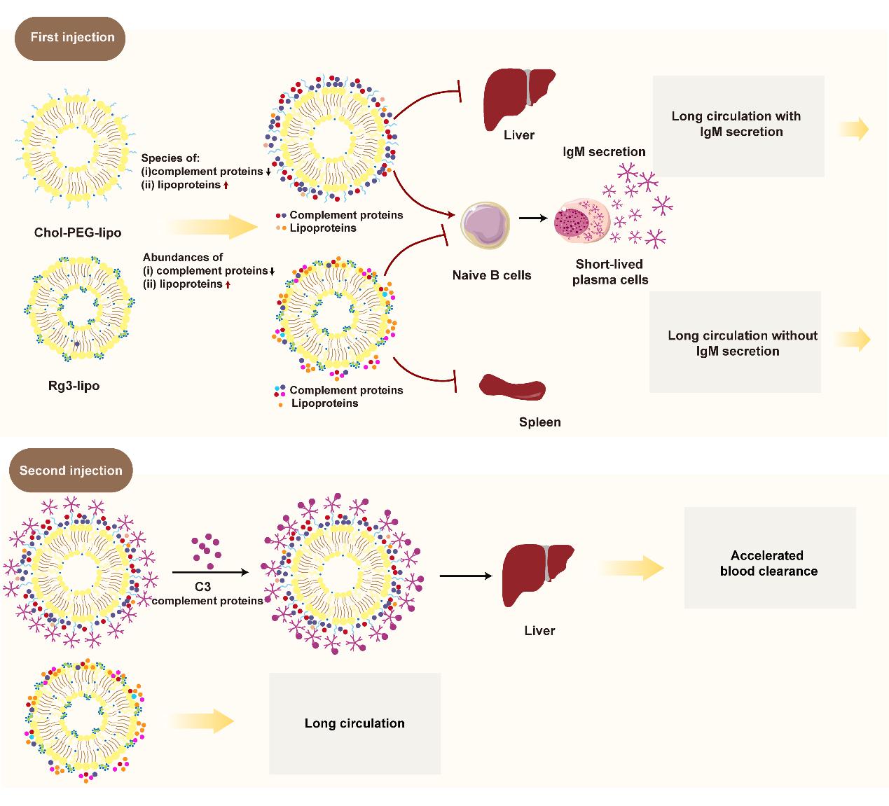 图2. Rg3-lipo和Cho-PEG-lipo重复注射的体内过程示意图
