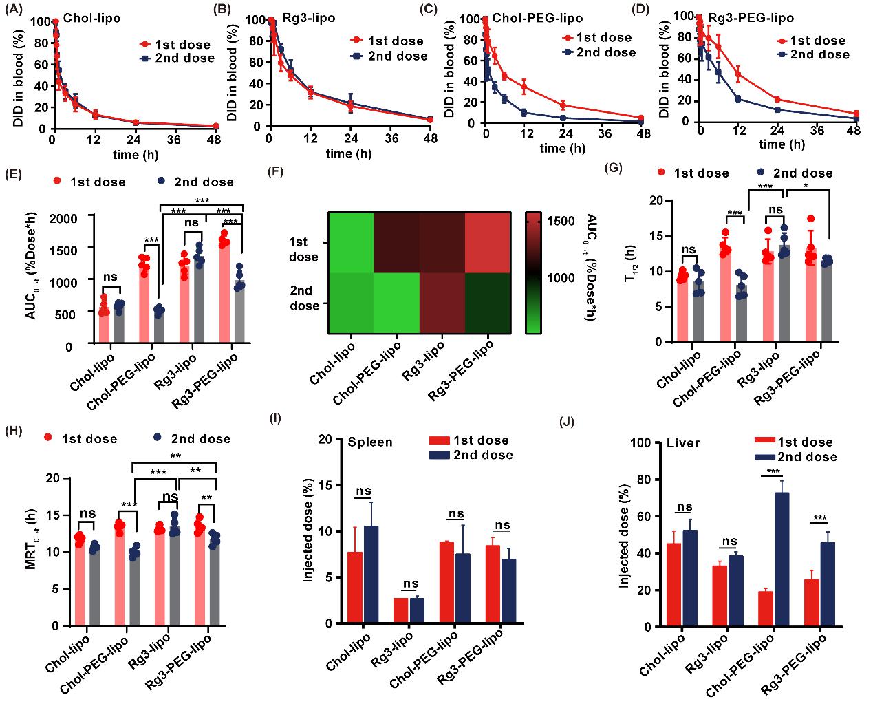 图4. Rg3-lipo和Cho-PEG-lipo在第一剂量和第二剂量下的药代动力学
