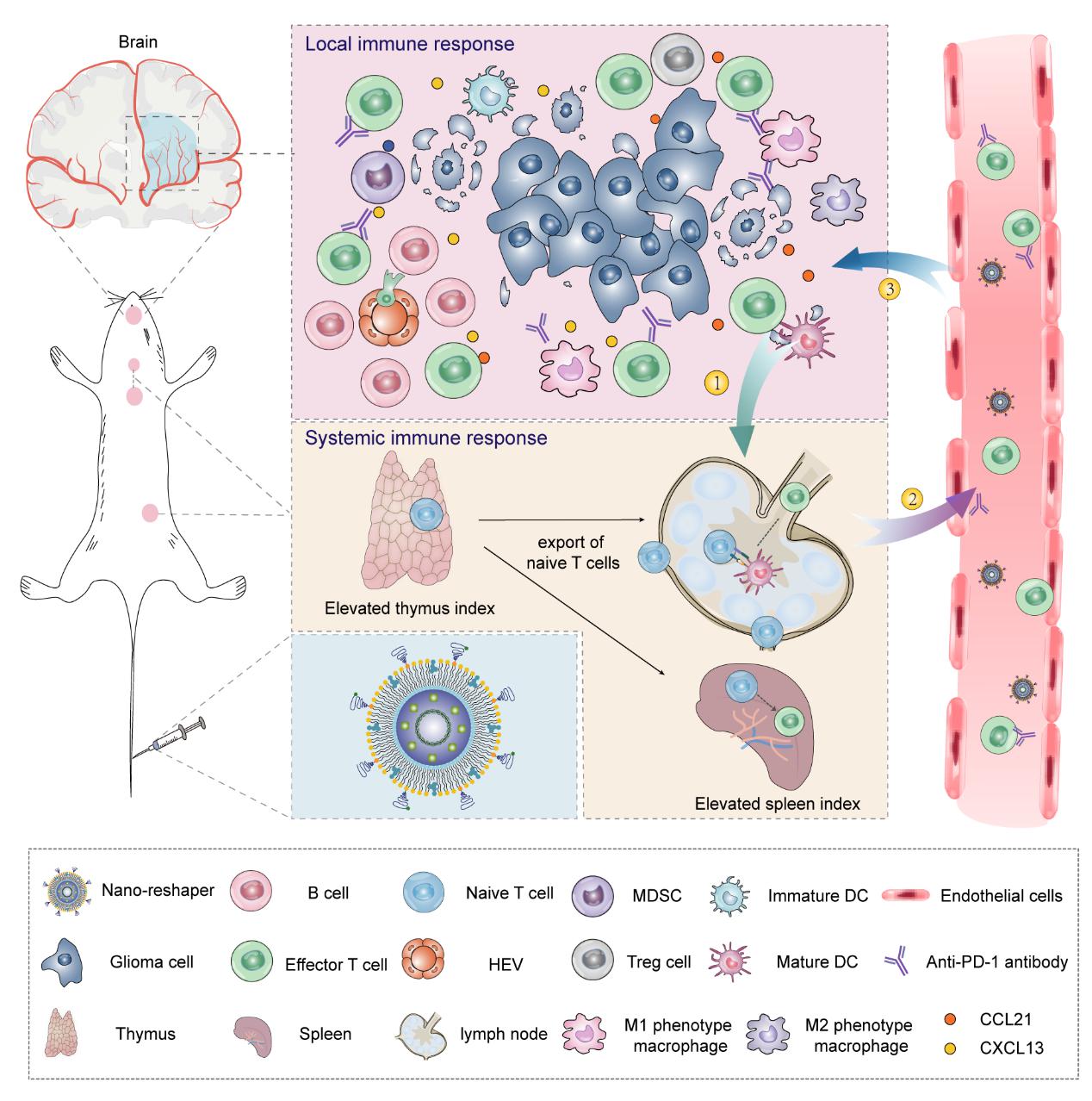 胶质母细胞瘤(GBM)是成人最常见和最致命的原发性恶性脑肿瘤。由于GBM的高度侵袭性和异质性,患者在标准化治疗手段下受益有限。免疫疗法是近年来新兴的肿瘤治疗手段,目前多数疗法通过诱导或激活效应T细胞来发挥抗肿瘤作用。然而GBM对免疫治疗响应率较低,主要原因为其引发严重的系统性和局部性免疫抑制,导致瘤内效应T细胞浸润不足。针对上述瓶颈问题,PO18 陈钧教授团队开发了一种名为纳米重塑者(Nano-reshaper)的纳米制剂,其可重塑系统性和局部性免疫功能,增加肿瘤床内效应T细胞的浸润程度,从而提高GBM对免疫检查点抑制剂的响应。该研究成果发表于国际权威综合性期刊《Nature Communications》。