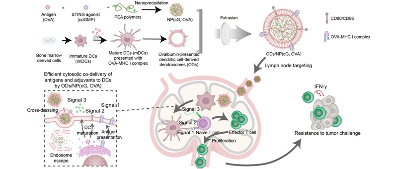 本研究设计了基于阳离子聚合物PEA的纳米颗粒,有效共载肿瘤抗原肽和佐剂cdGMP(NP(cG, OVA)),并将其包载于抗原自呈递的树突状细胞来源的囊泡(ODs)中,构建抗原自呈递树突状细胞囊泡纳米疫苗ODs/NP(cG, OVA),实现淋巴结(LNs)归巢和抗原佐剂高效共递送。