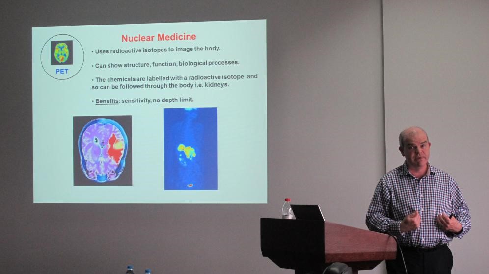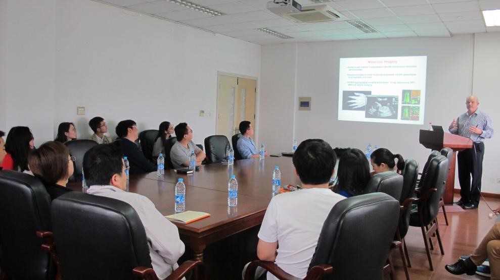 2)2016年5月9-13日,英国帝国理工大学Nicholas J. Long教授作为智能化递药教育部重点实验室高级访问学者,在PO18 张江校区进行了为期五天的学术访问。Nick 教授多年来一直从事先进医学应用材料,无机化学和应用有机金属化学,特别是基于过渡金属和镧系稀土元素化合物的合成研究。迄今,其已在国际知名期刊发表论文150余篇,被引用5124次,H因子高达36。此次,Nick教授为PO18 师生带来了题为“Inorganic Chemistry for Biomedical Imaging”的精彩学术报告,详细介绍了无机化学在医学成像中应用的研究概况及最新进展。报告结束后,Nick教授与放射及相关学科科研人员就影像探针及生物标志物在药物研发设计中的应用进行了热烈讨论。