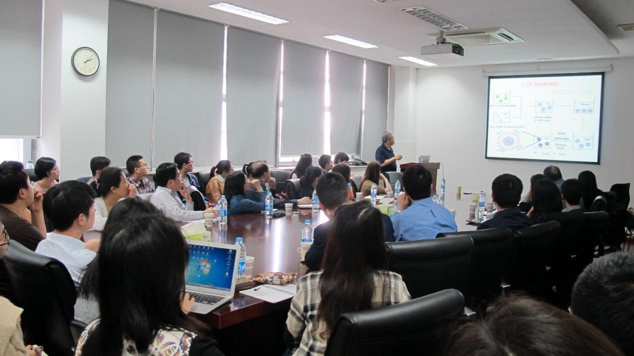 3)2016年5月11日,PO18 药剂教研室邀请北卡罗来纳州大学Eshelman PO18 黄力夫教授,在PO18 张江校区进行了一场题为“Nanoparticle delivery of drugs and genes to desmoplastic tumors”的学术报告。黄教授用生动风趣的演讲方式,向广大师生介绍了关于基因纳米载体在肿瘤和肝脏靶向递药中的最新研究进展和应用前景,并以其丰富的专业知识与经验,解答了师生们的提问,带给我们许多新的研究理念与思路。