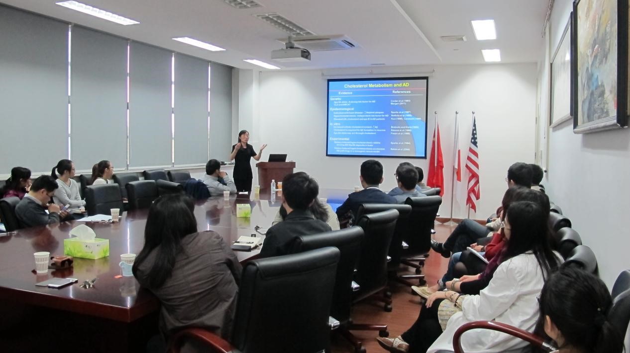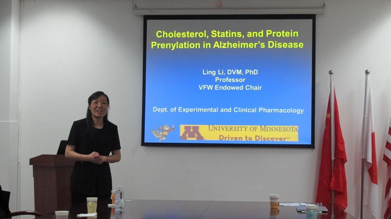 1)2016年4月20日,PO18 药剂教研室邀请美国明尼苏达大学实验与临床药理学李玲教授来访,并为PO18 广大师生带来了题为“Cholesterol, Statins, and Protein Prenylation in Alzheimer’s Disease”的精彩学术报告。李教授主要从事血脂代谢异常与阿尔茨海默病(AD)发病机制研究。先后承担NIH/NIA、阿尔茨海默病药物发现基金会等研究项目。李教授的讲座内容与药剂学密切相关,受到热烈欢迎。