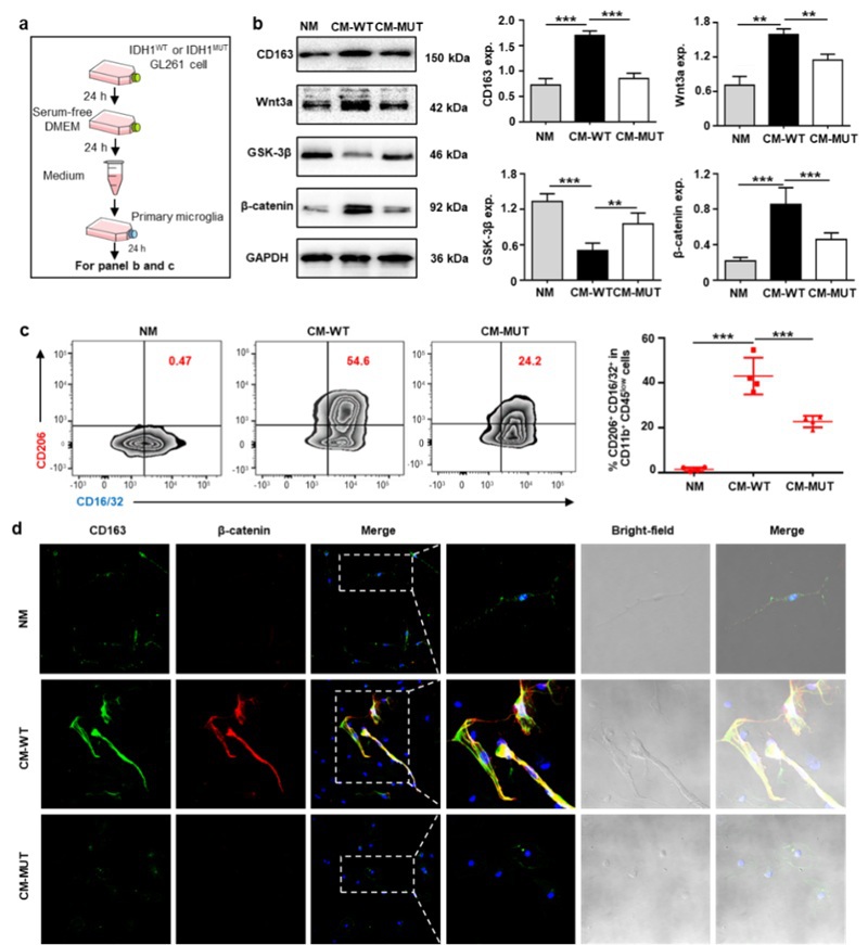 图3. IDH1WT癌细胞培养液激活了原代小胶质细胞Wnt/β-catenin通路并诱导其向抑炎表型极化。(a)用IDH1WT或IDH1MUT GL261胶质瘤细胞衍生条件培养液处理原代小胶质细胞的示意图。原代小胶质细胞经IDH1WT细胞(CM-WT)、IDH1MUT细胞(CM-MUT)的条件培养液或正常的F12完全培养液(NM)处理24 h后,进行Western blot实验。(b)经上述条件培养液处理后小胶质细胞中CD163,Wnt3a,GSK-3β和β-catenin蛋白的Western blot结果图及其统计图。(c)经上述条件培养液处理后小胶质细胞的流式分析结果图。(d)经上述条件培养液处理后小胶质细胞的免疫荧光染色结果图。