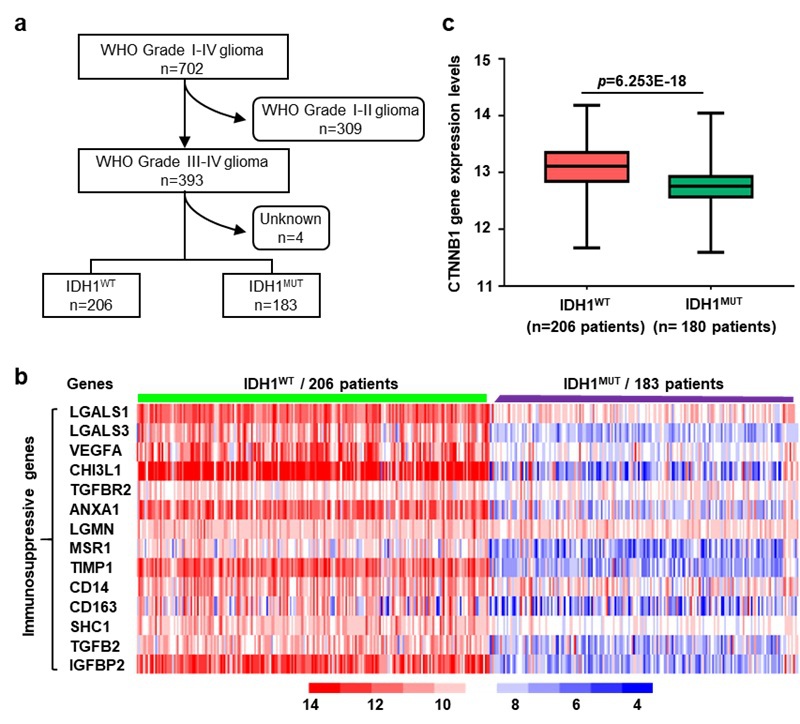 图1. IDH1WT和IDH1MUT胶质瘤患者中免疫抑制基因与CTNNB1基因表达情况。(a)胶质瘤患者数据筛选流程图。(b)IDH1WT胶质瘤患者中免疫抑制基因高表达。(c)IDH1WT胶质瘤患者中CTNNB1基因高表达。