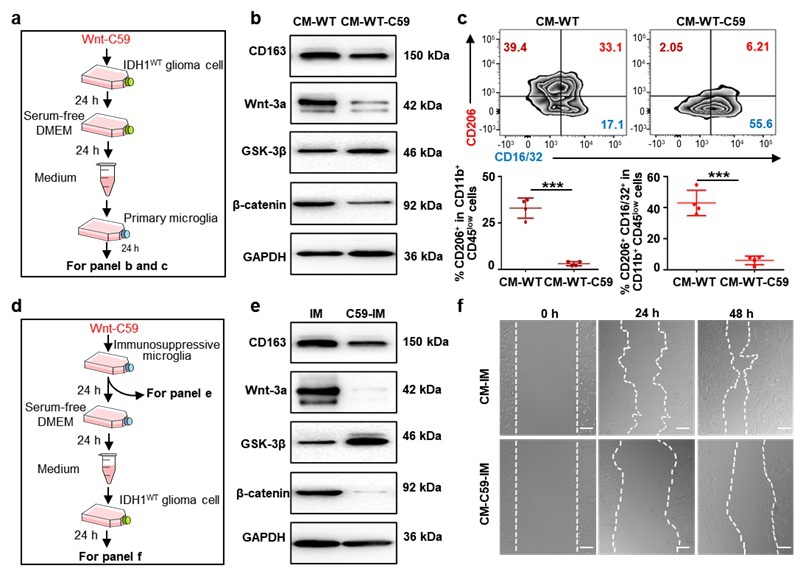 图4. Wnt抑制剂阻碍小胶质细胞抑炎极化及癌细胞迁移。(a)用Wnt-C59处理的IDH1WT GL261胶质瘤细胞培养液或未经处理条件培养液作用于原代小胶质细胞的示意图。(b)上述条件培养液处理后的小胶质细胞中CD163,Wnt3a,GSK-3β和β-catenin蛋白的Western blot结果图。(c)经上述条件培养液处理后小胶质细胞的流式分析结果图。(d)抑炎型小胶质细胞经Wnt-C59处理后实验操作的示意图。(e)抑炎型小胶质细胞经Wnt-C59处理24 h后,CD163,Wnt3a,GSK-3β和β-catenin蛋白的Western blot结果图。(f)IDH1WT GL261肿瘤细胞经Wnt-C59(CM-C59-IM)和未经Wnt-C59(CM-IM)处理后的抑炎型小胶质细胞培养液刺激24 h后的划痕实验结果图。